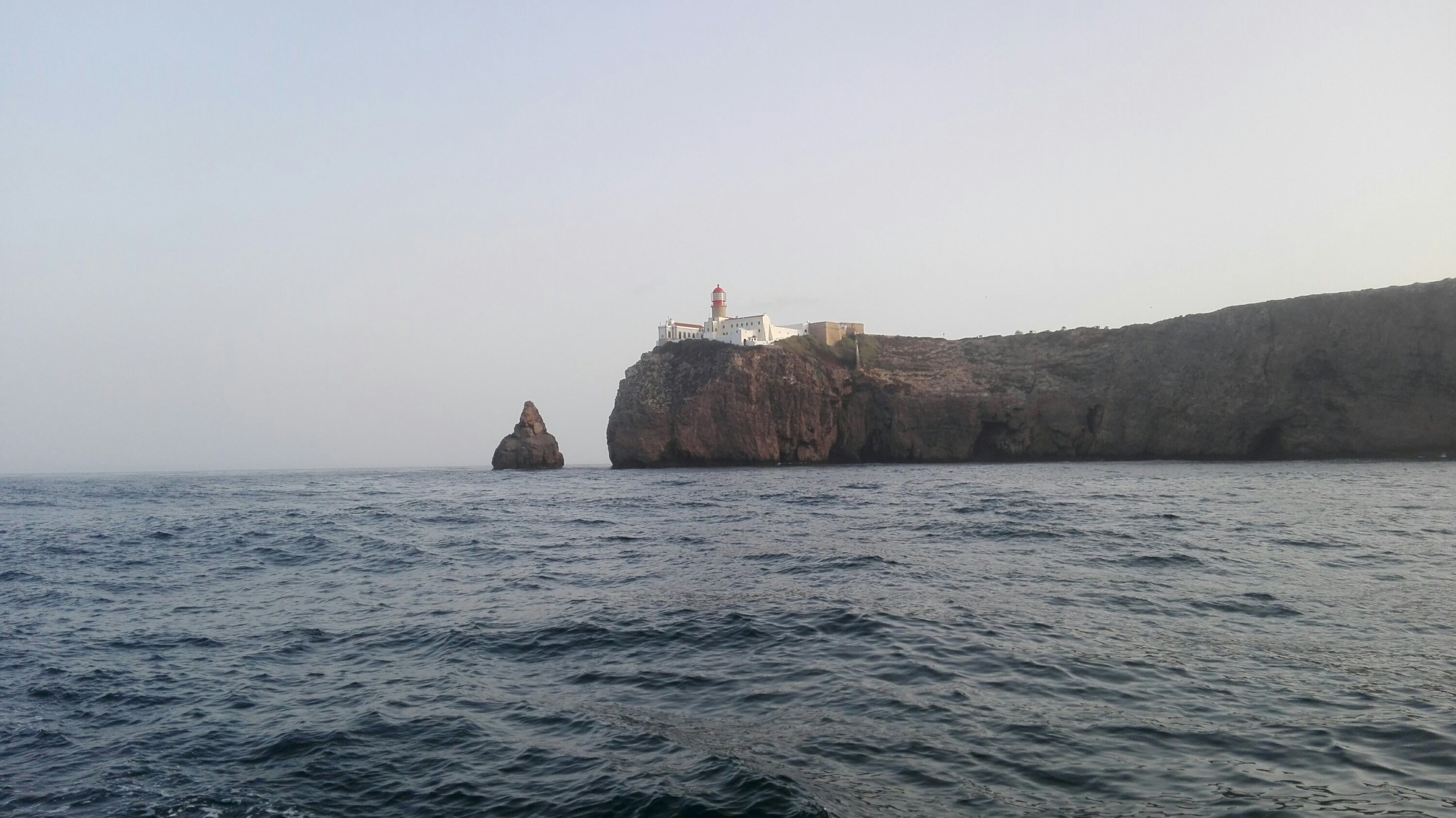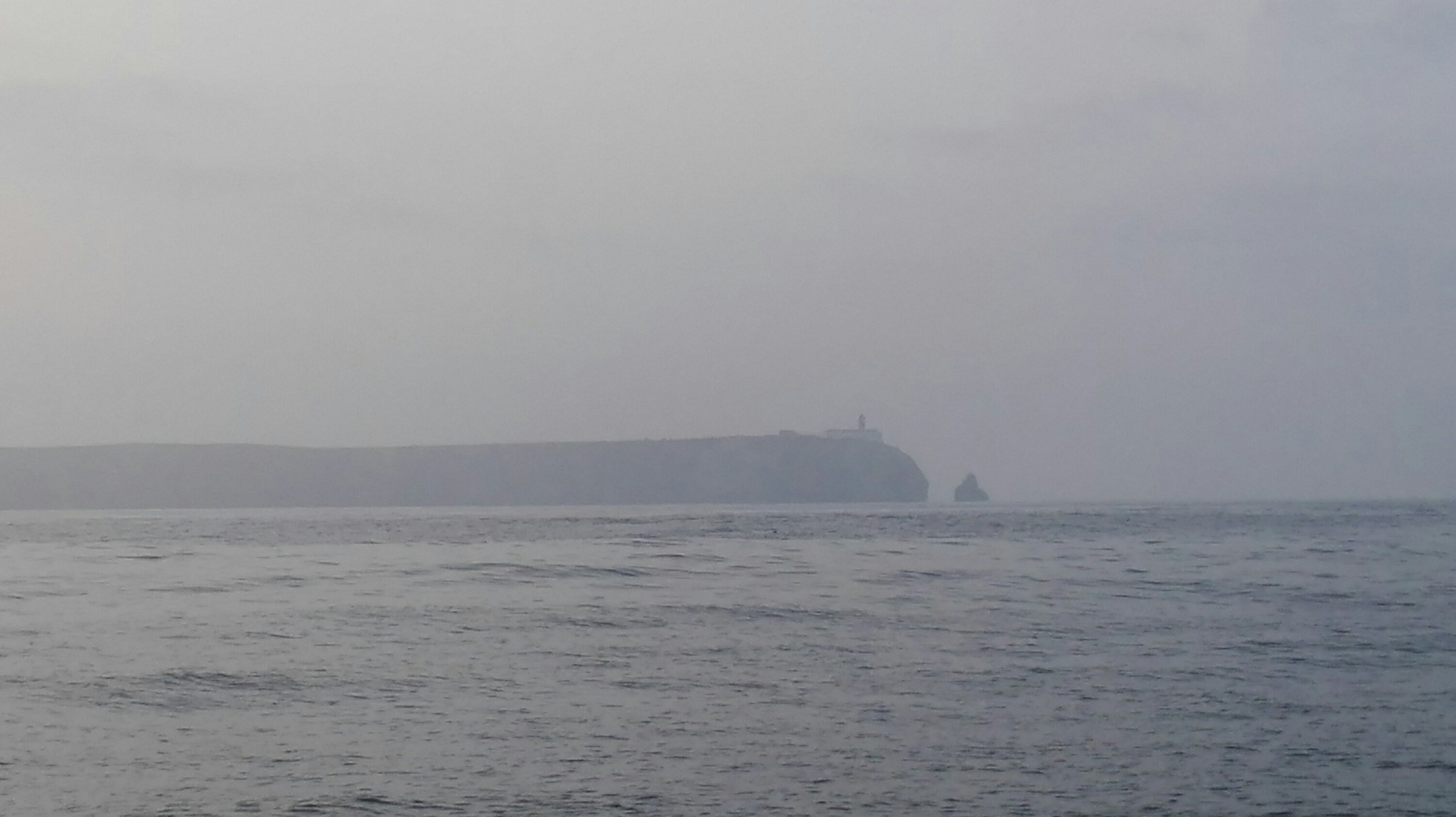 Endlich, kurz nach Sonnenaufgang taucht nach 10 1/2 Stunden der südwestlichsten Punkt Europas, das Cabo de São Vicente aus dem Morgennebel auf.