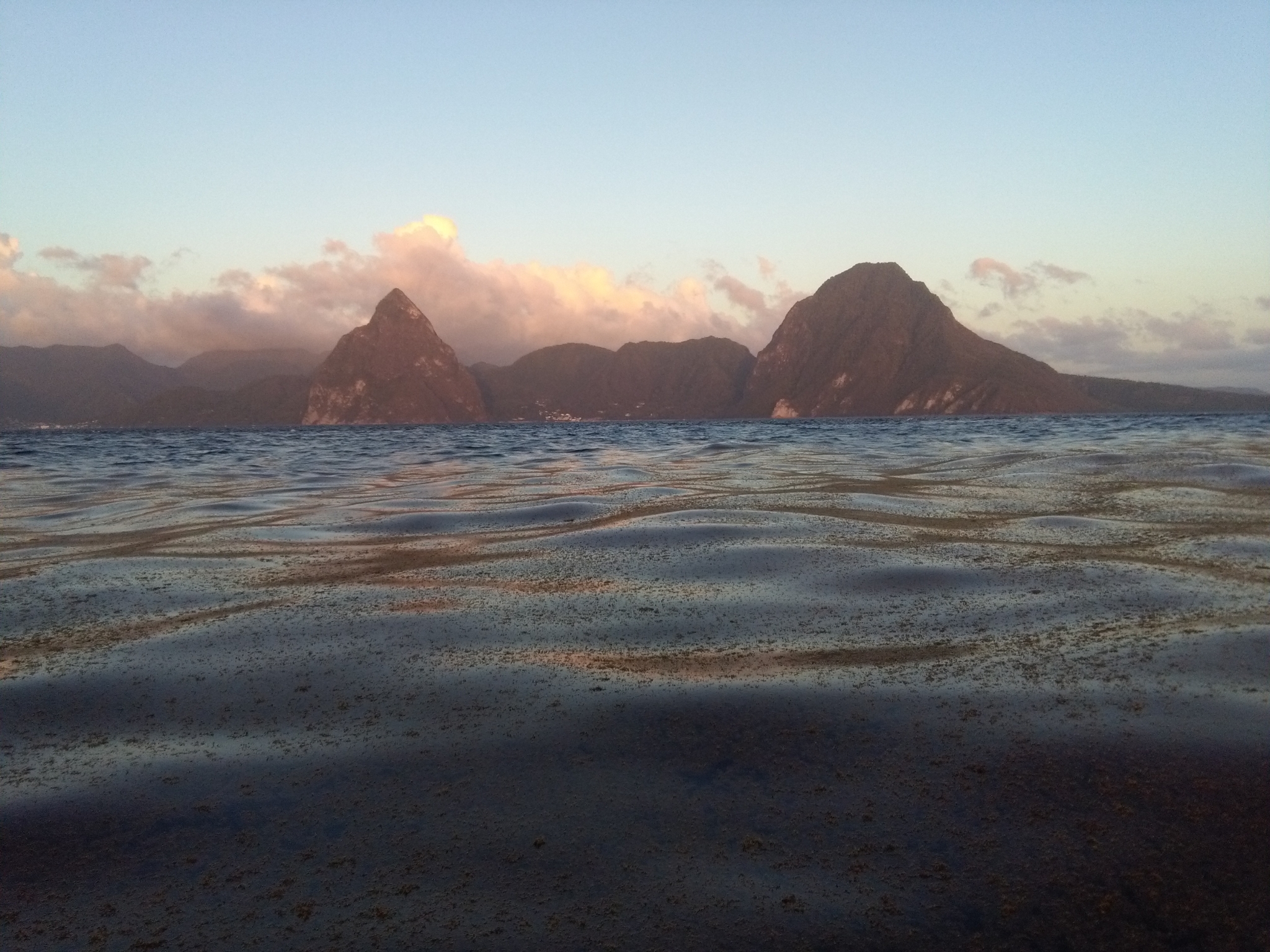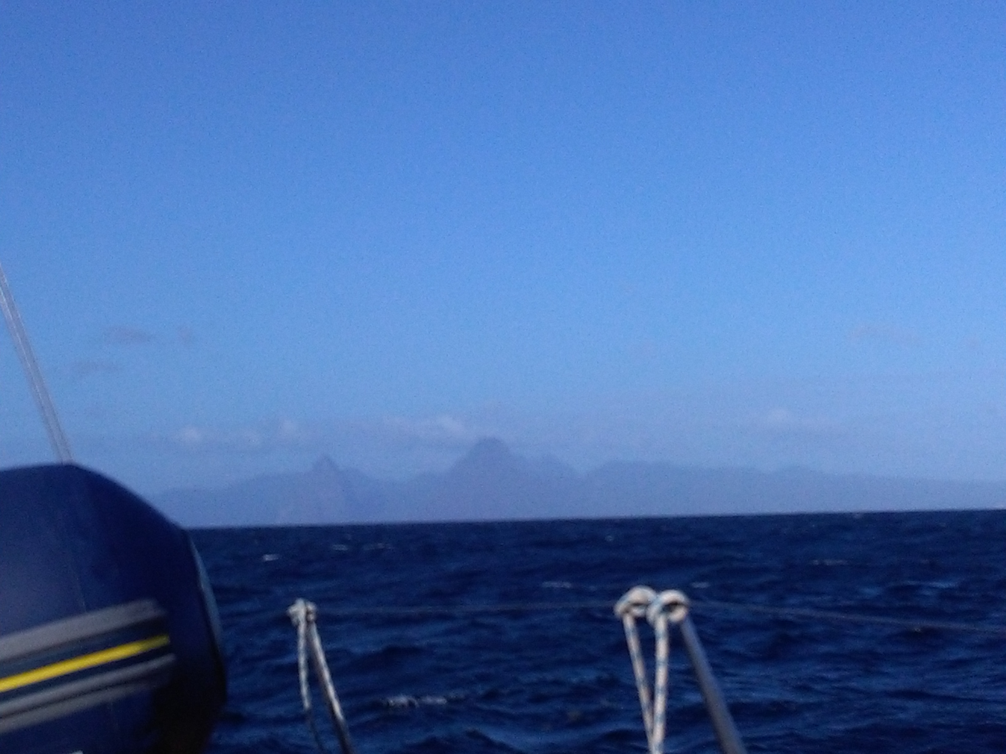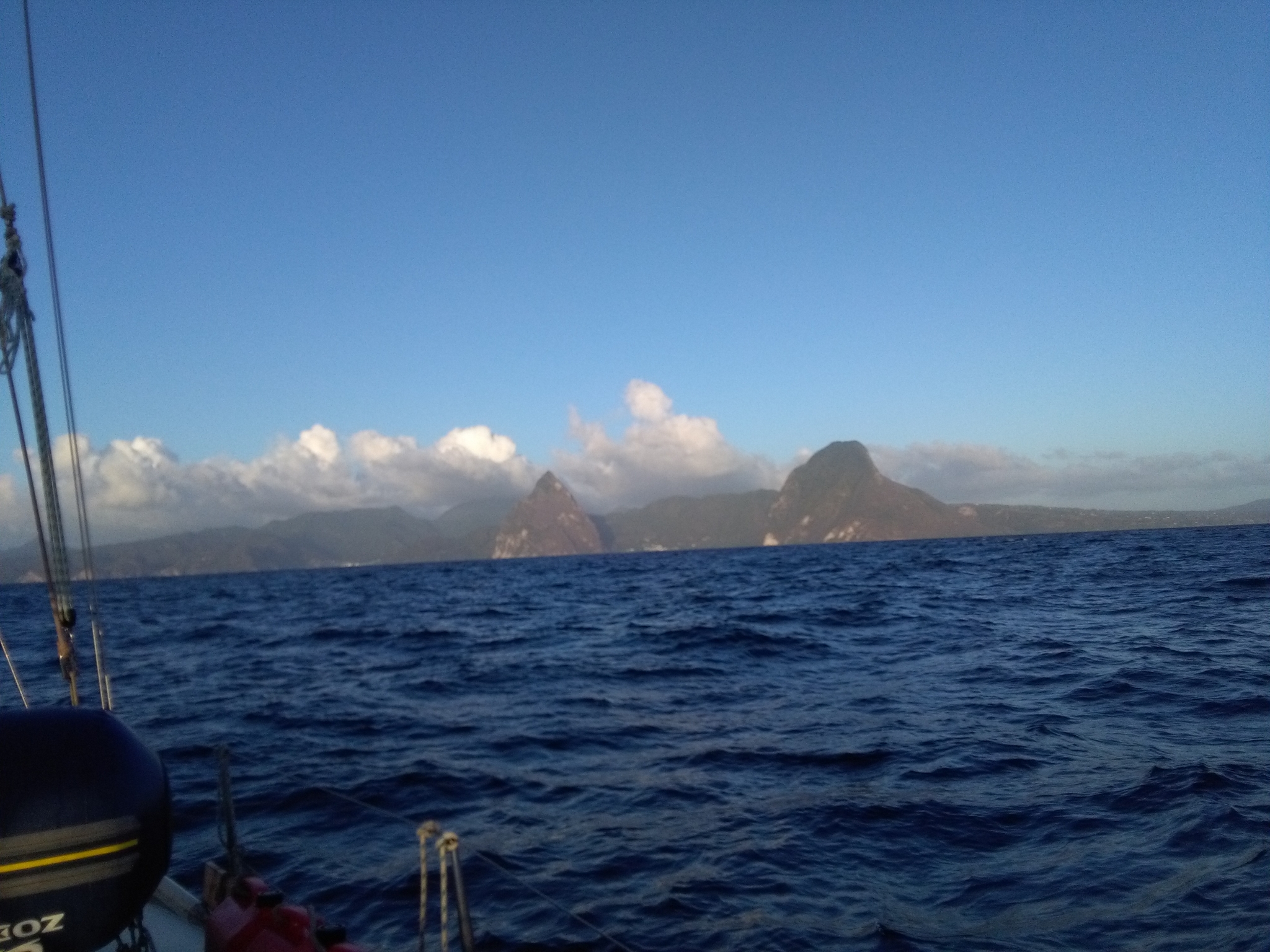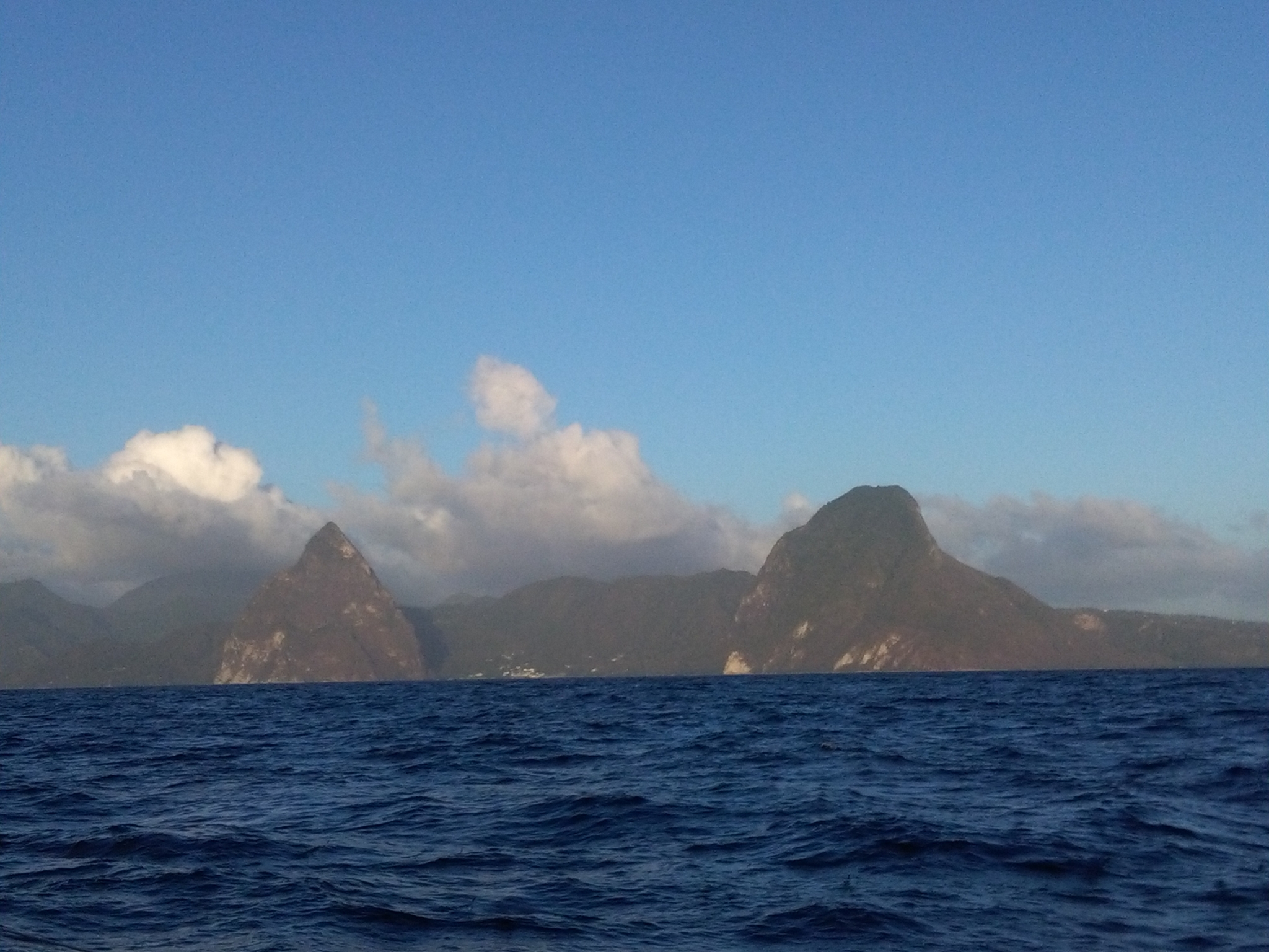 Gegen 16 Uhr tauchen die beiden Pitons vor uns im Dunst auf, St.Lucia