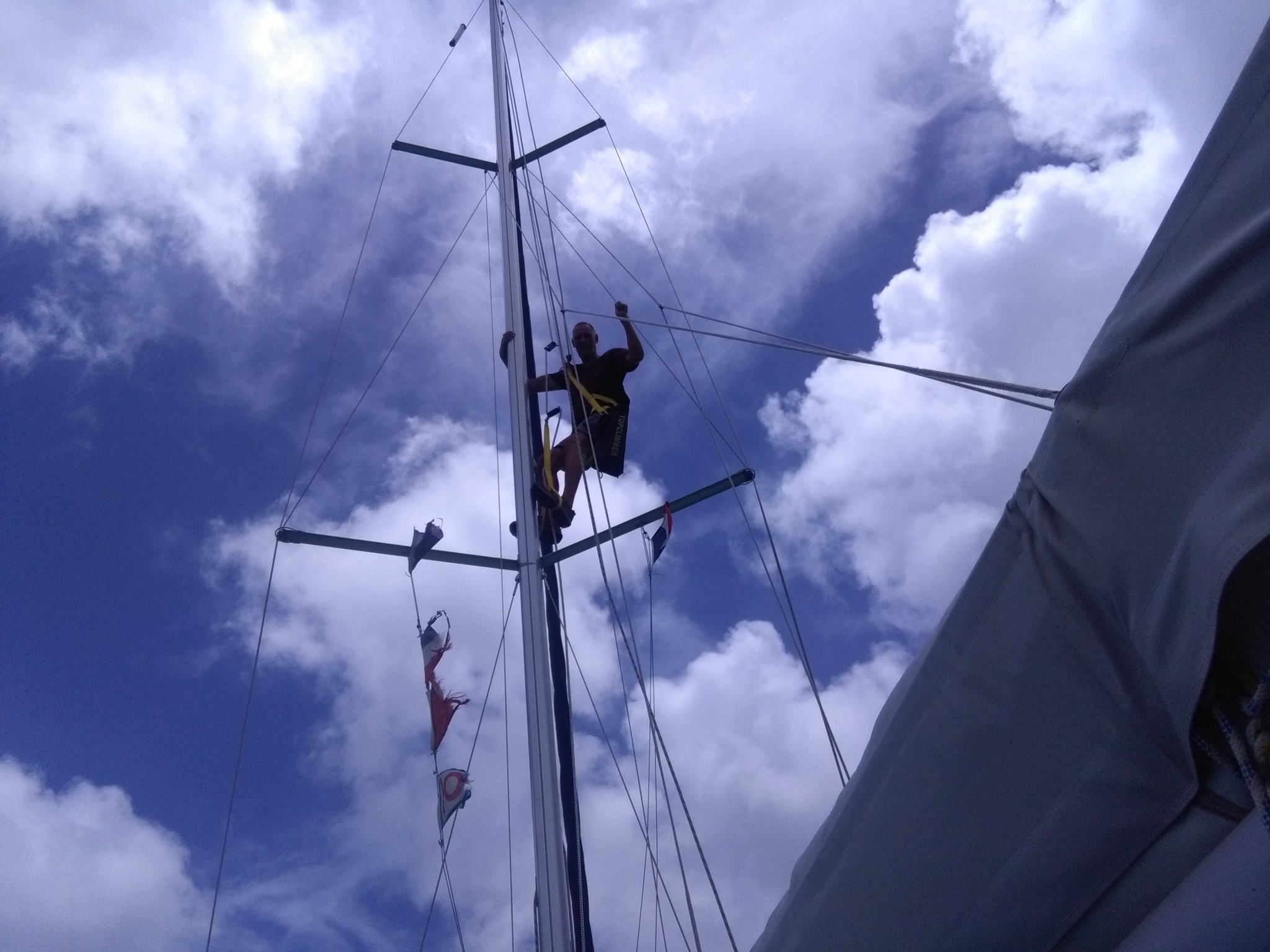 Heute muss Stefan mit dem Bootsmannstuhl auf den Mast hoch (etwa 18m Höhe). Immer wieder aufregend. Diese Aktion ist nicht ungefährlich.