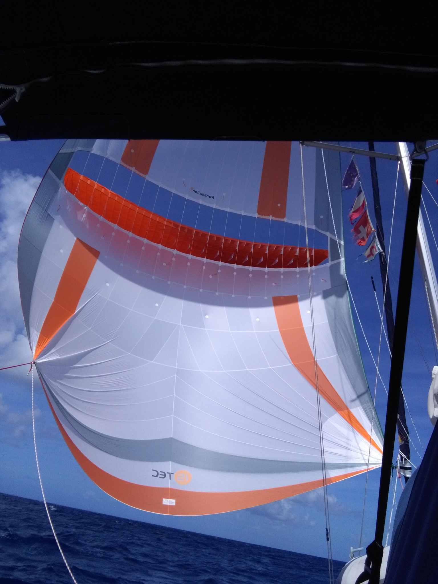 Um 9.15 Uhr ist der Parasailor nach langem mal wieder gesetzt. Und nun flitzen wir gegen Westen.