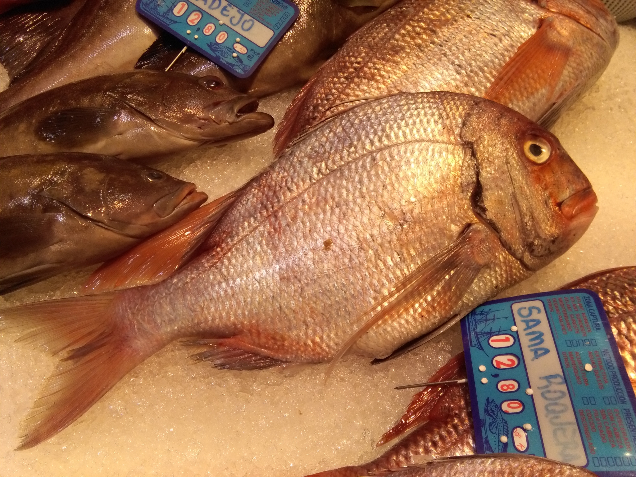 Wir besorgen einen Sama Roqujera (Rotbrandbrasse) vom Fischmarkt fürs Abendbrot.