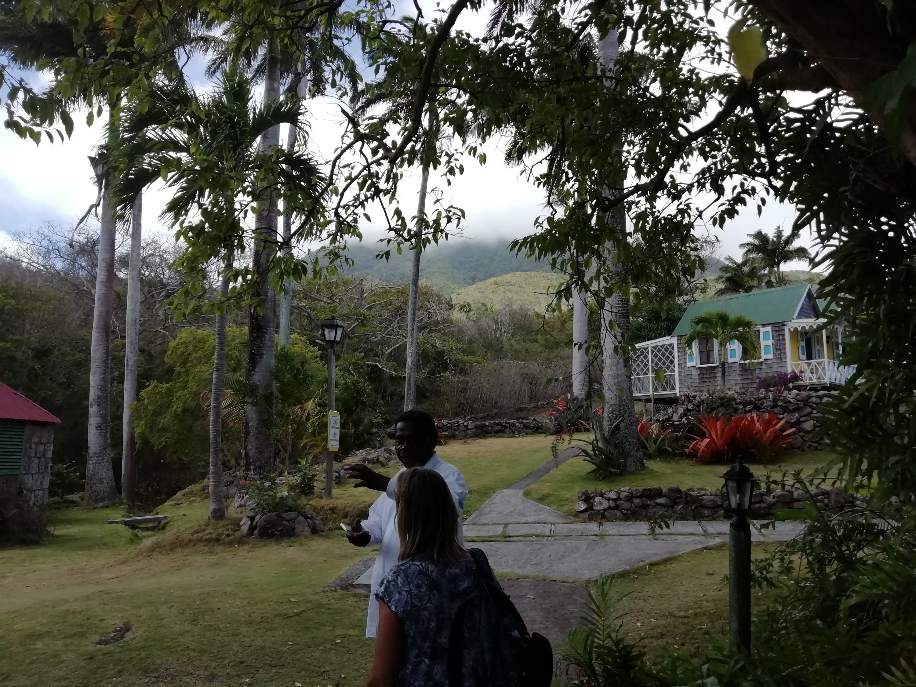 Ein Taxifahrer bietet uns eine Inseltour für nur 75 Dollars an. Allerdings US Dollars! Wir handeln den Preis runter. Kein Problem für den Guten. Dann gibt es halt auch nur das abgespeckte Besichtigungspaket und so lassen wir uns die „Highlights“ der Insel zeigen. Hauptsächlich beschränkt sich dieses auf die zu Hotels umgebauten ehemaligen Zuckerrohrplantagen, wo wir schnurstracks durch die alten Gutsgebäude und Gärten geführt werden.