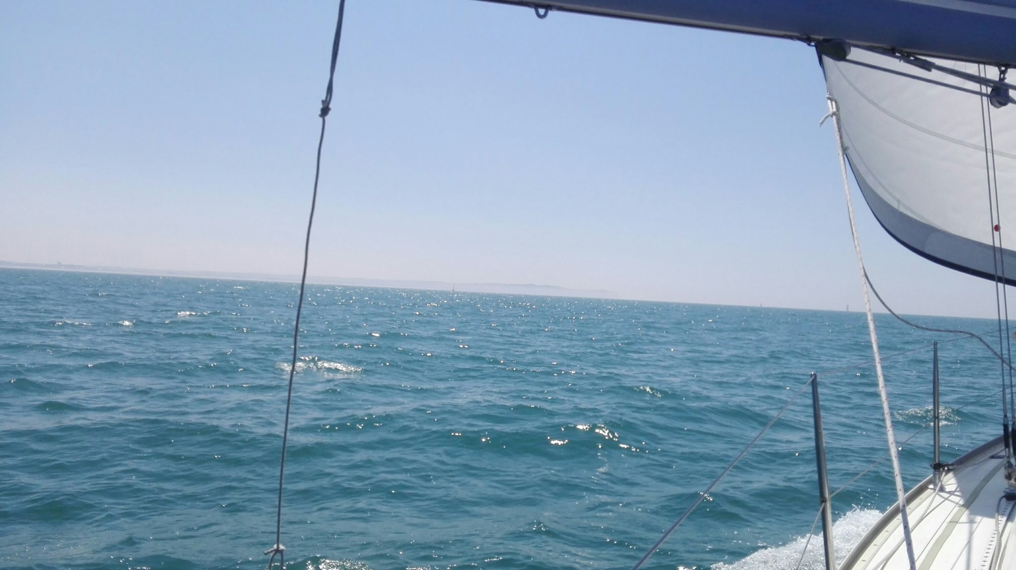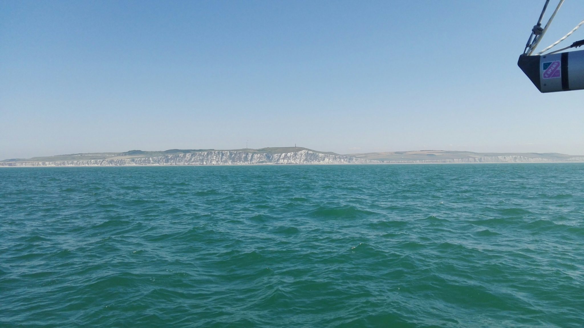 Ein traumhafter Segeltörn, bei vollster Sonne und blauem Himmel. Die Strömung beschleunigt unser Boot auf fast 8 Knoten. Die weißen Klippen tauchen backbordseitig vor uns im Dunst auf. Auf der Steuerbordseite sind gleichzeitig die Klippen von Dover zu sehen. Ein faszinierender Anblick von der Seeseite her.