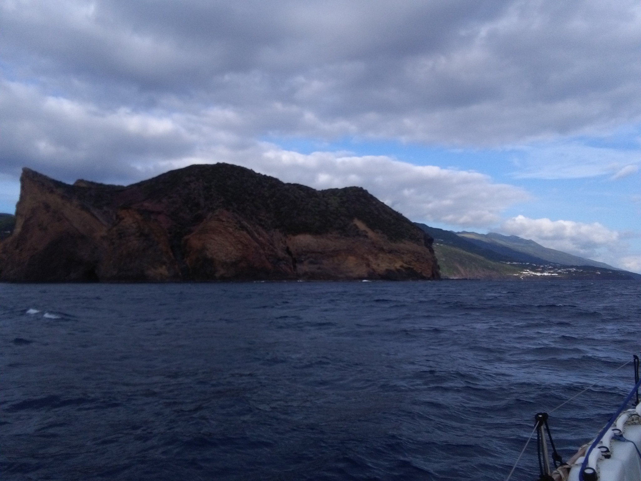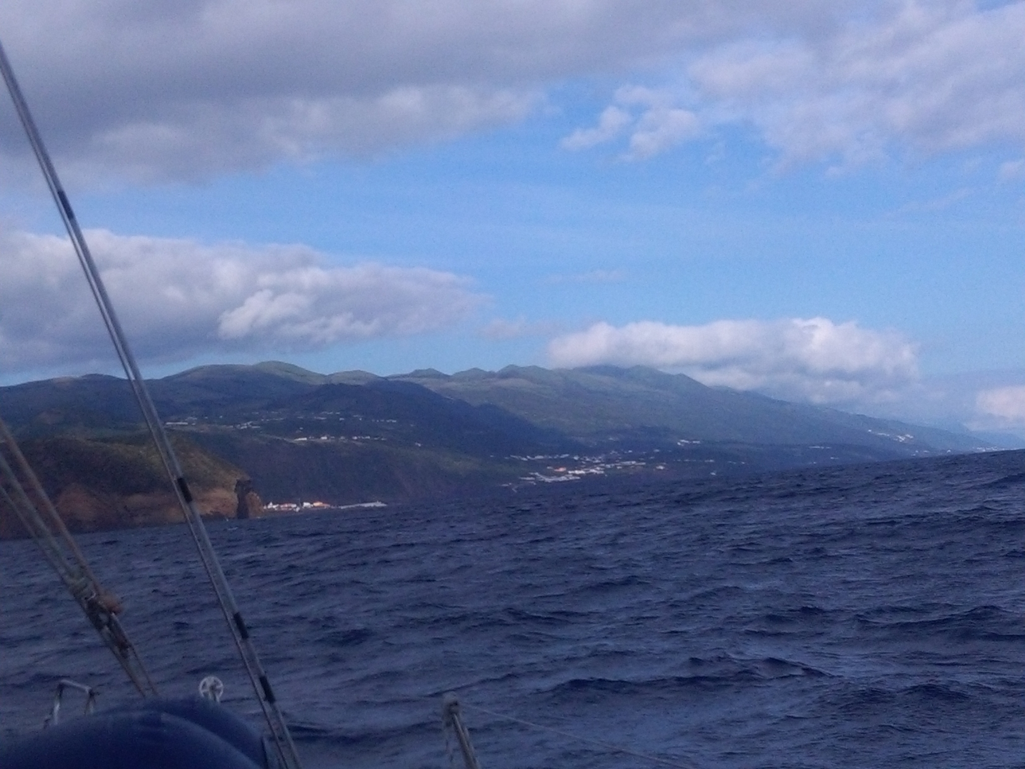 Der Wind wird ordentlich verwirbelt zwischen den Inseln und dreht immer wieder.Wir kommen etwas mühsam voran und sind nach gut sechs Stunden auf Sâo Jorge, im Hafen von Velas.