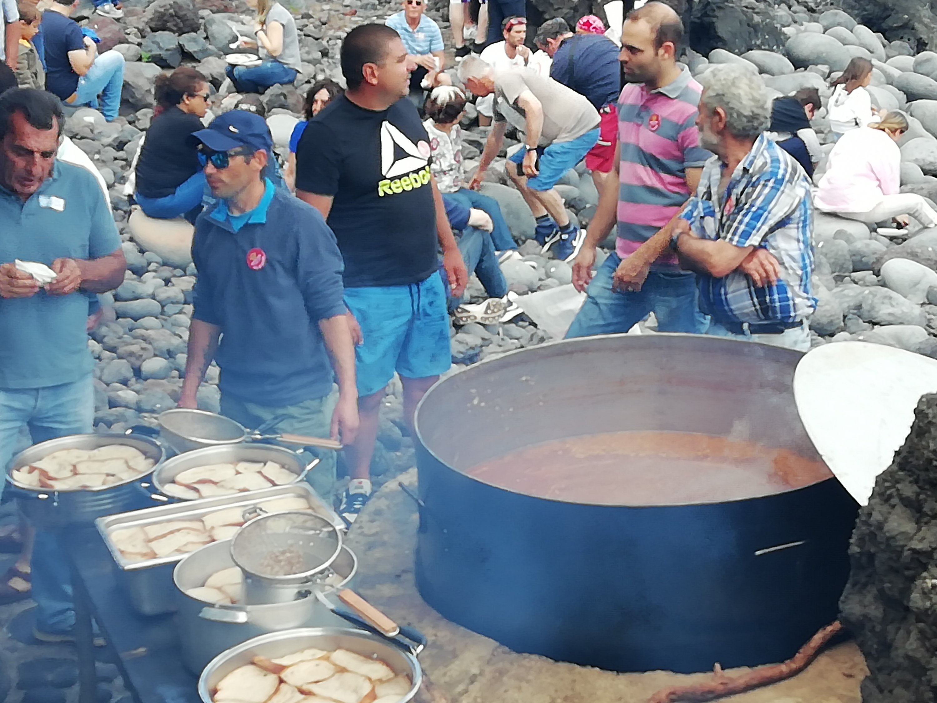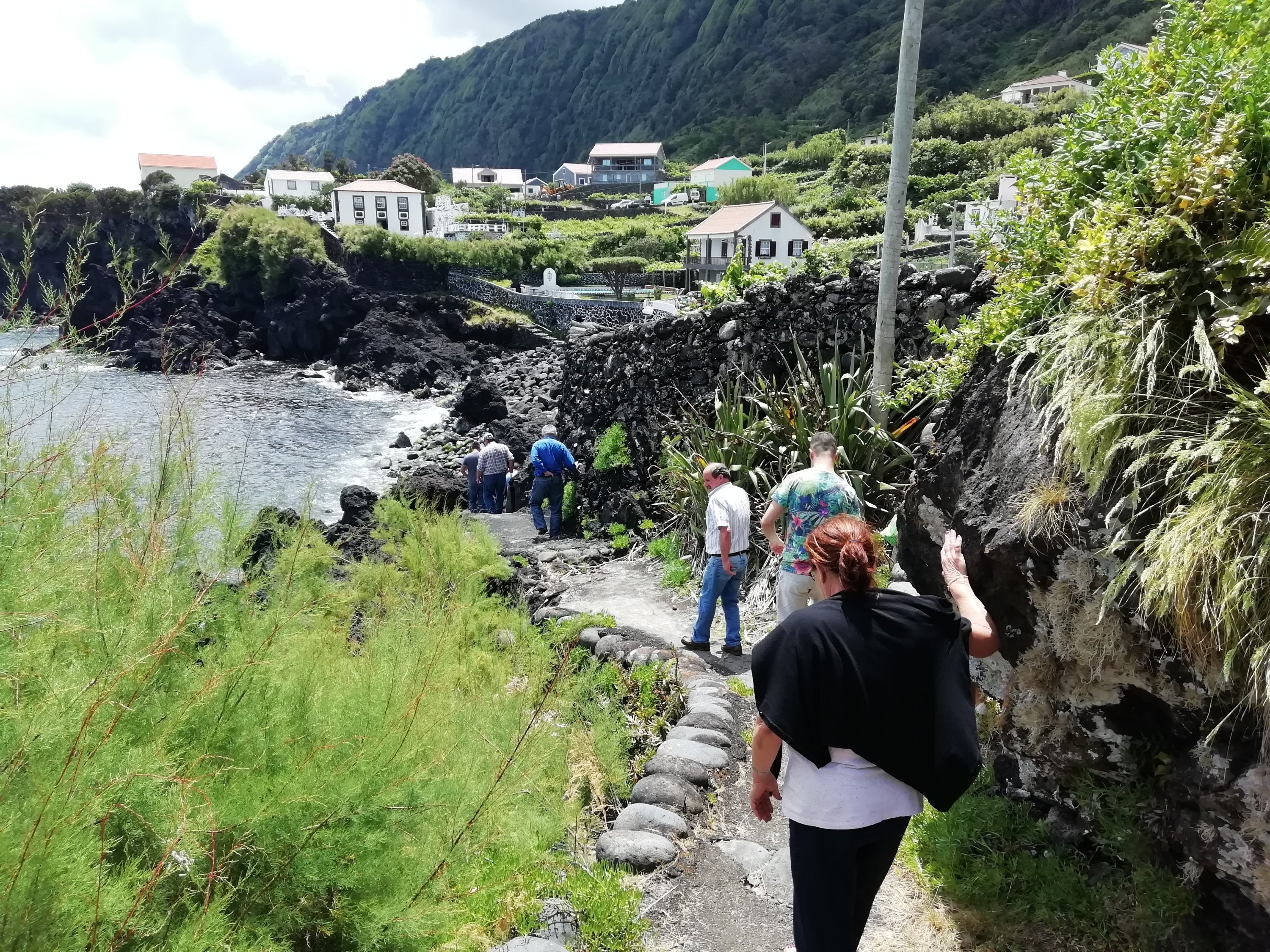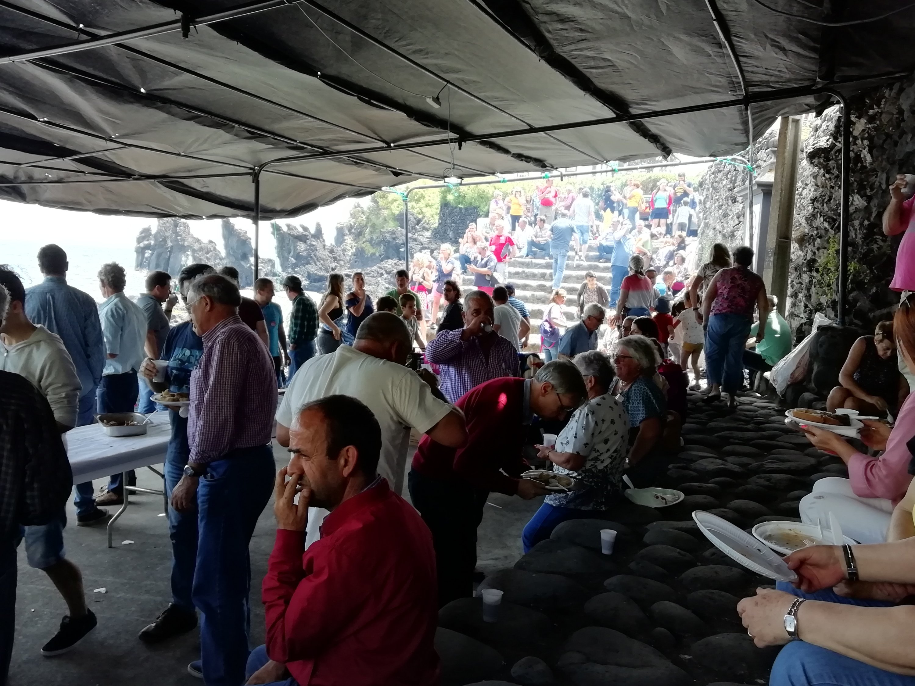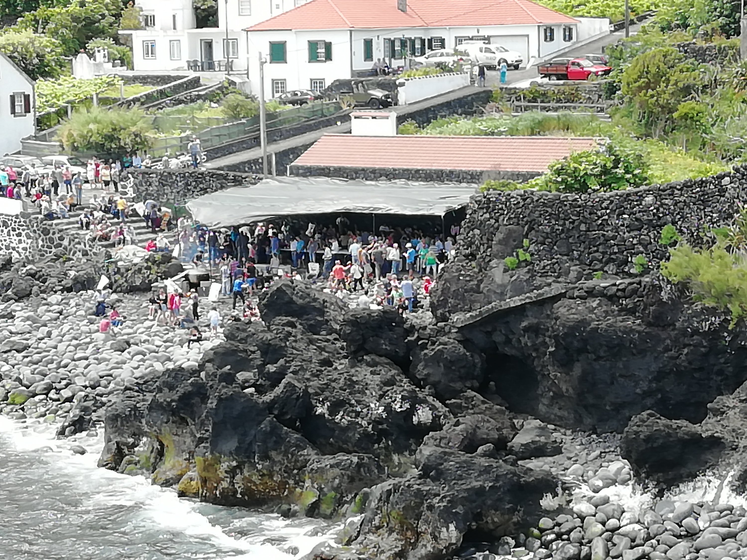 Der Mietwagen ist schnell gemietet. Auf geht’s. Die nächste Insel will entdeckt werden. Im Tourist Office wurde auf zwei Orte hingewiesen wo es heute die Suppe gäbe. Suppe?!? Na ja – la Festas do Divino Espirito Santo – das Fest des Heiligen Geistes – so etwas weiß man doch, oder? Wir sind gespannt. Viele Straßen gibt es ja nicht. In der ersten genannten Ortschaft links ab. Einen steilen Weg zum Hafen hinunter. Tatsache – da unten zwischen den Klippen gibt es eine Menschenansammlung.