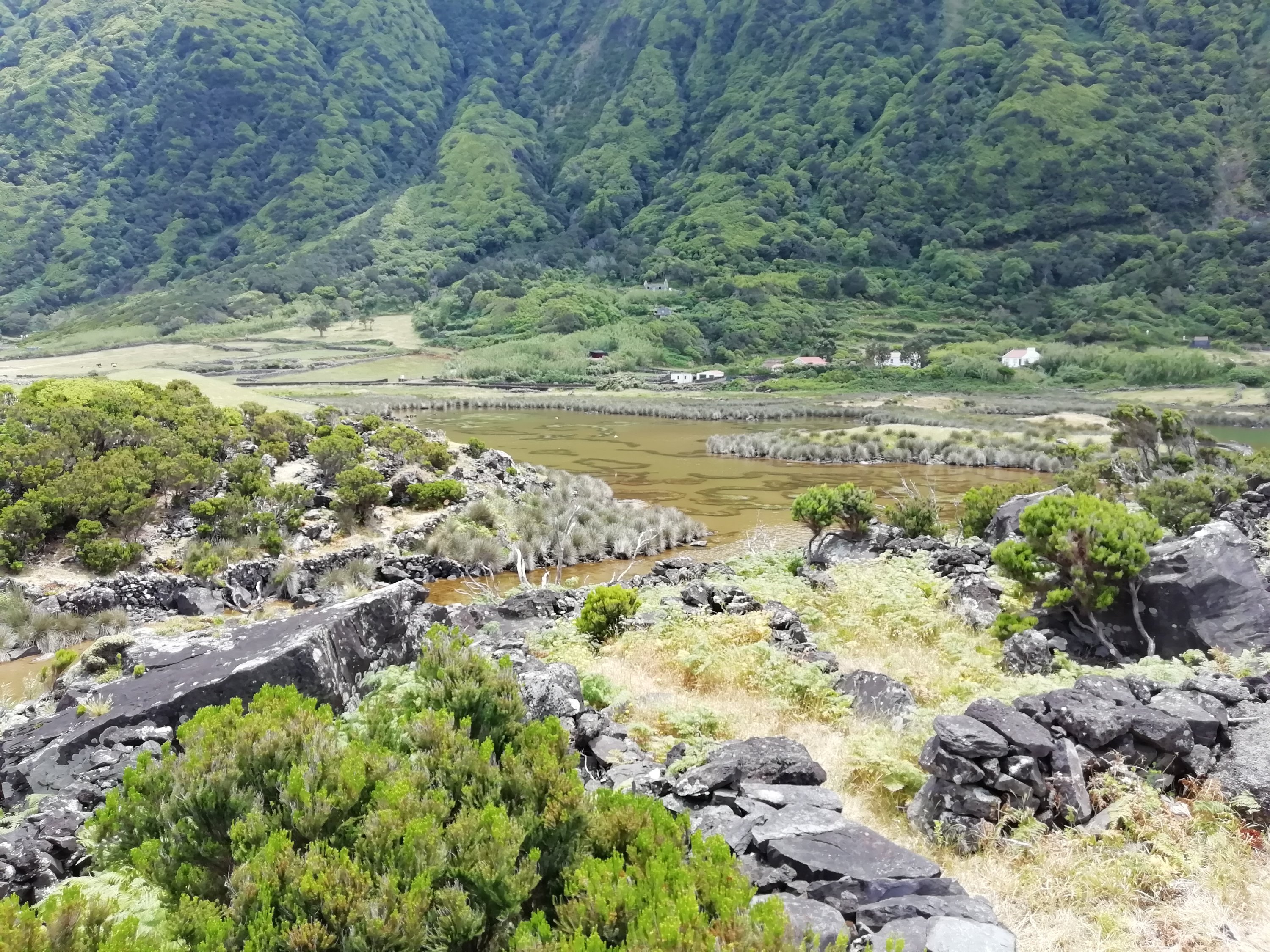 Gut gestärkt geht es weiter zur Insel Besichtigung. Kaum sind wir auf der Hauptstraße fahren wir an einem einsamen Tramper vorbei. Wir zögern nicht lange und bieten ihm einen Lift an. Jaques – ein Frankokanadier verbringt einen Wanderurlaub auf Sao Jorge – und den restlichen Nachmittag mit uns. Gemeinsam besuchen wir eine Faja. Auch wenn wir zu diesem Zeitpunkt noch nicht verstehen, was es genau ist. Wir rätseln, ob es sich dabei um die kleinen Dörfer oder die, durch Mauern aus Lavagestein, abgetrennten Felder handelt.Nichts davon! Nein – Hangrutschungen sind es. Auf dieser steilen Insel natürlich etwas ganz Besonderes. Entstanden wohl aufgrund tektonischer Ereignisse aus Geröll oder Lavaabgängen. Etwa 40 davon gibt es auf Sao Jorge. Für die ersten Siedler ein Geschenk. Die fruchtbaren, in Meereshöhe liegenden Flächen waren für Ackerbau und Viehzucht wie geschaffen.