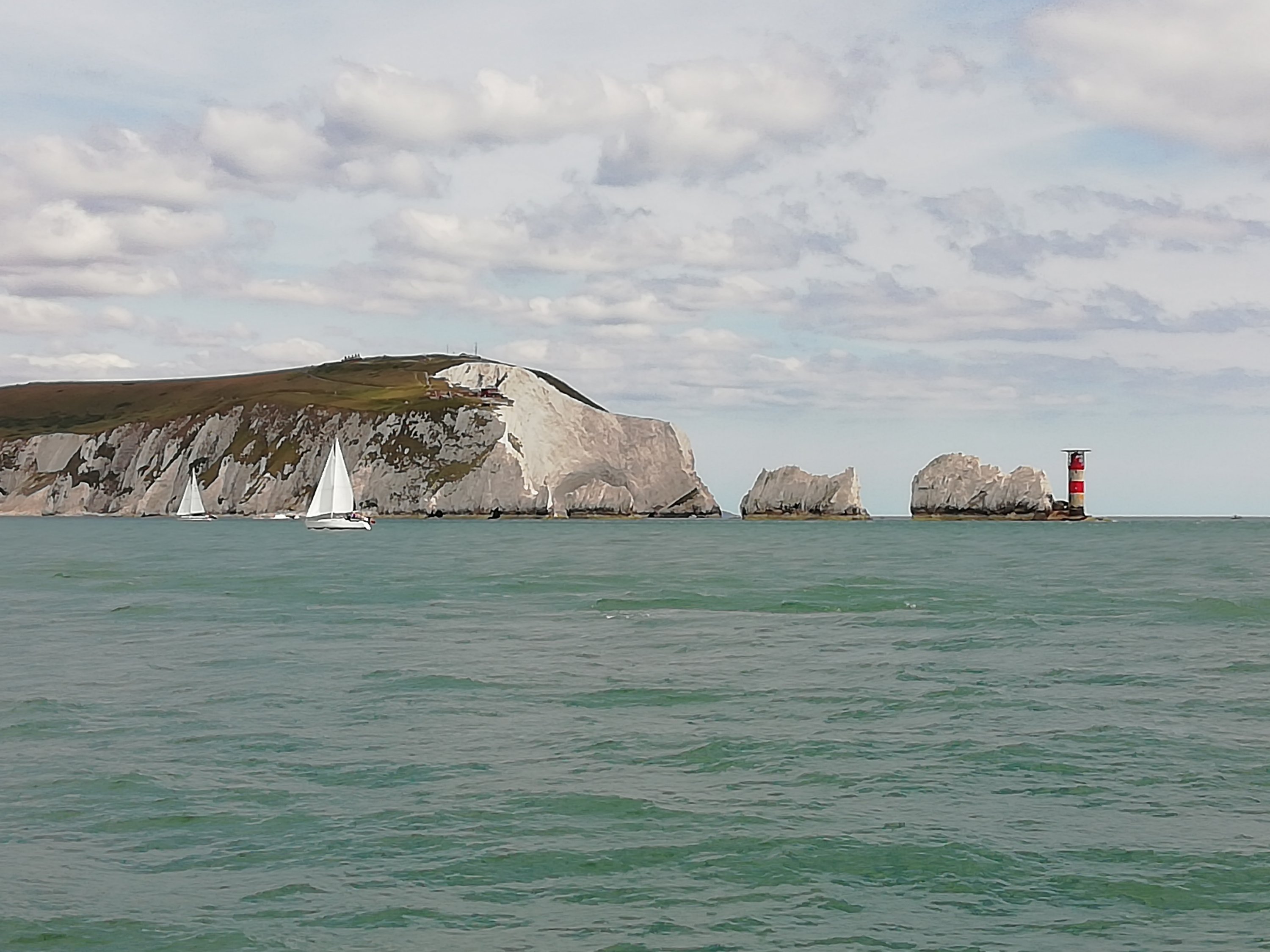Die enge Kanaleinfahrt vor den Kalkfelsen ist heute, bei ruhigem Wetter, glücklicherweise ohne Schwierigkeiten zu passieren. Die Strömung beschleunigt unser Tempo und so erreichen wir am späten Nachmittag Cowes auf der “Isle of Wight“.