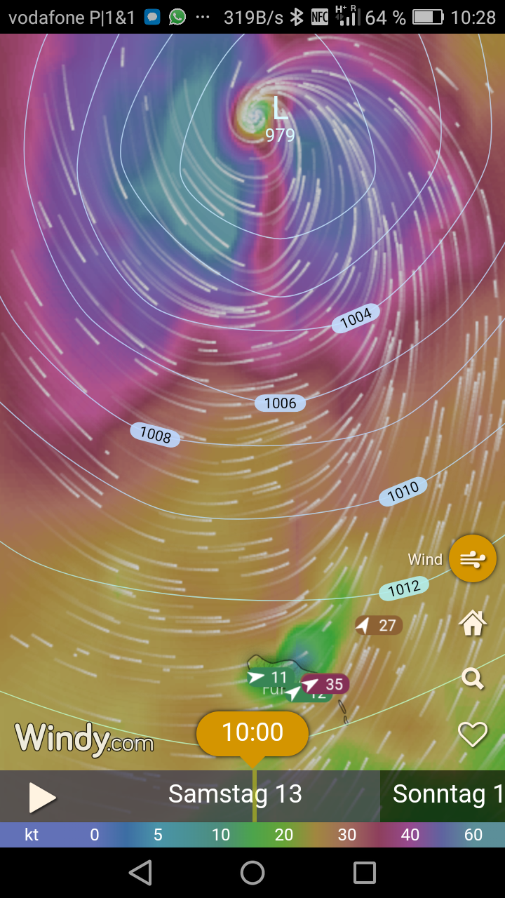 Wer hätte das für möglich gehalten. Ein Hurricane soweit nordöstlich im Atlantik. Das hat es seit dem Beginn der Wetteraufzeichnungen noch nicht gegeben. Die letzten Tage waren voller bangen und hoffen. Zunächst hieß es Leslie würde westlich von Madeira nach Süden abbiegen. Vorgestern dann der Schock. Der Kern des Hurricanes sollte nur 50 sm nördlich an Madeira vorbei und dann über die Insel Porto Santo ziehen. Für Madeira hätte das bedeutet, mitten im Feld des stärksten Windes zu liegen. Entsprechend angespannt war die Stimmung im Hafen. Gestern dann die Trendwende. Die Prognosen sahen Leslie deutlich nördlicher an Madeira vorbeiziehen. Und tatsächlich: