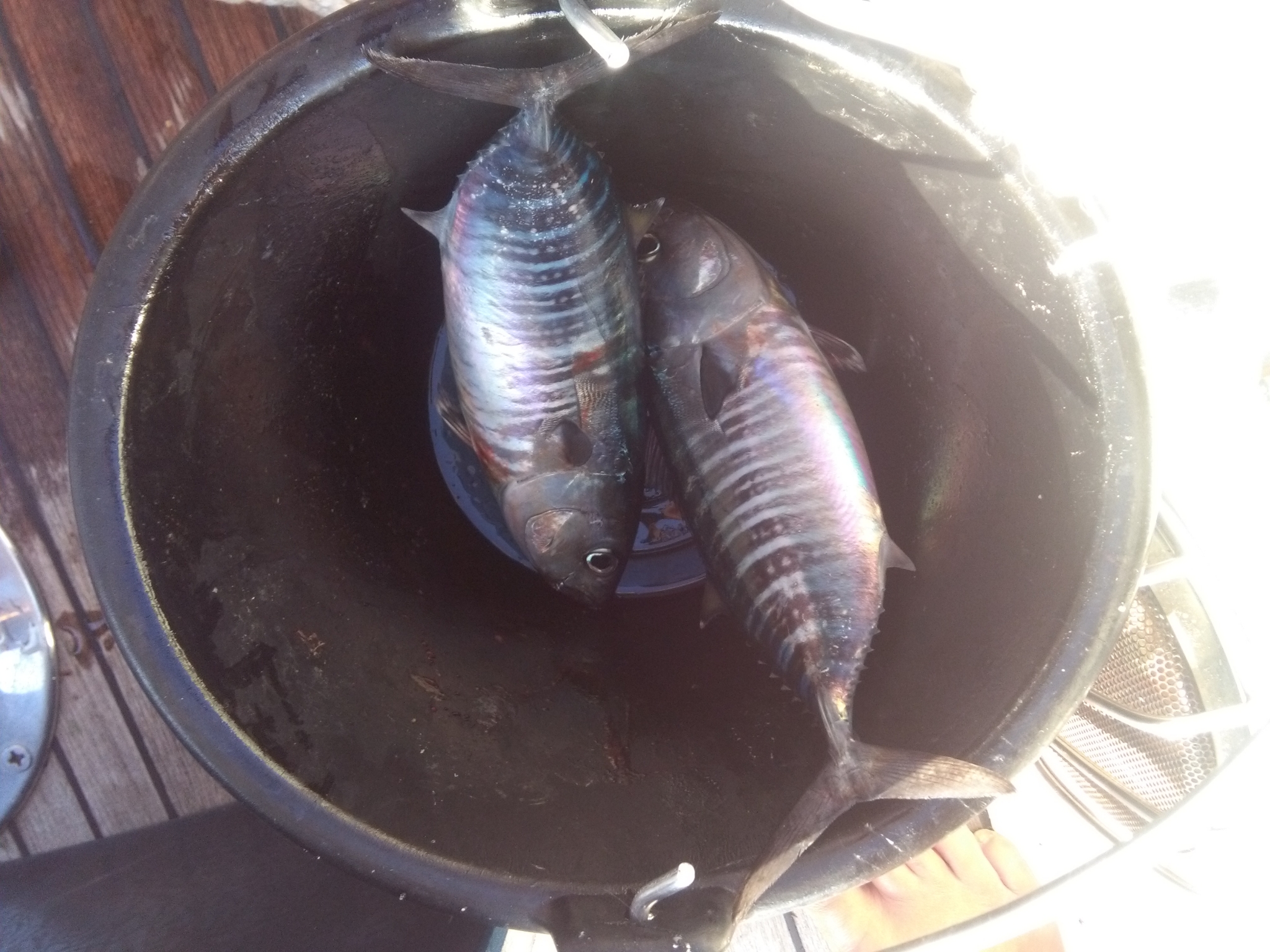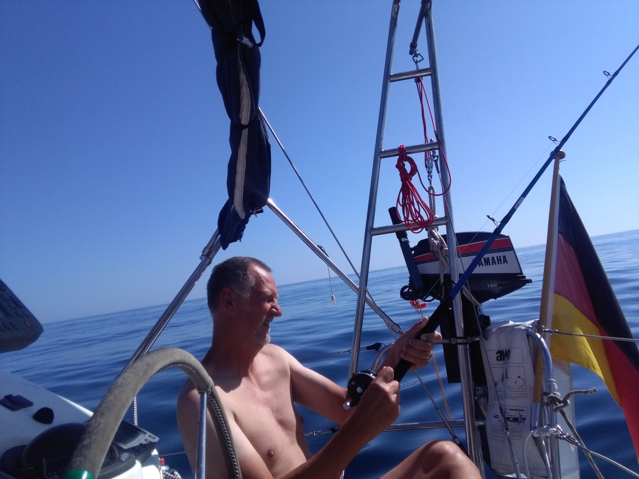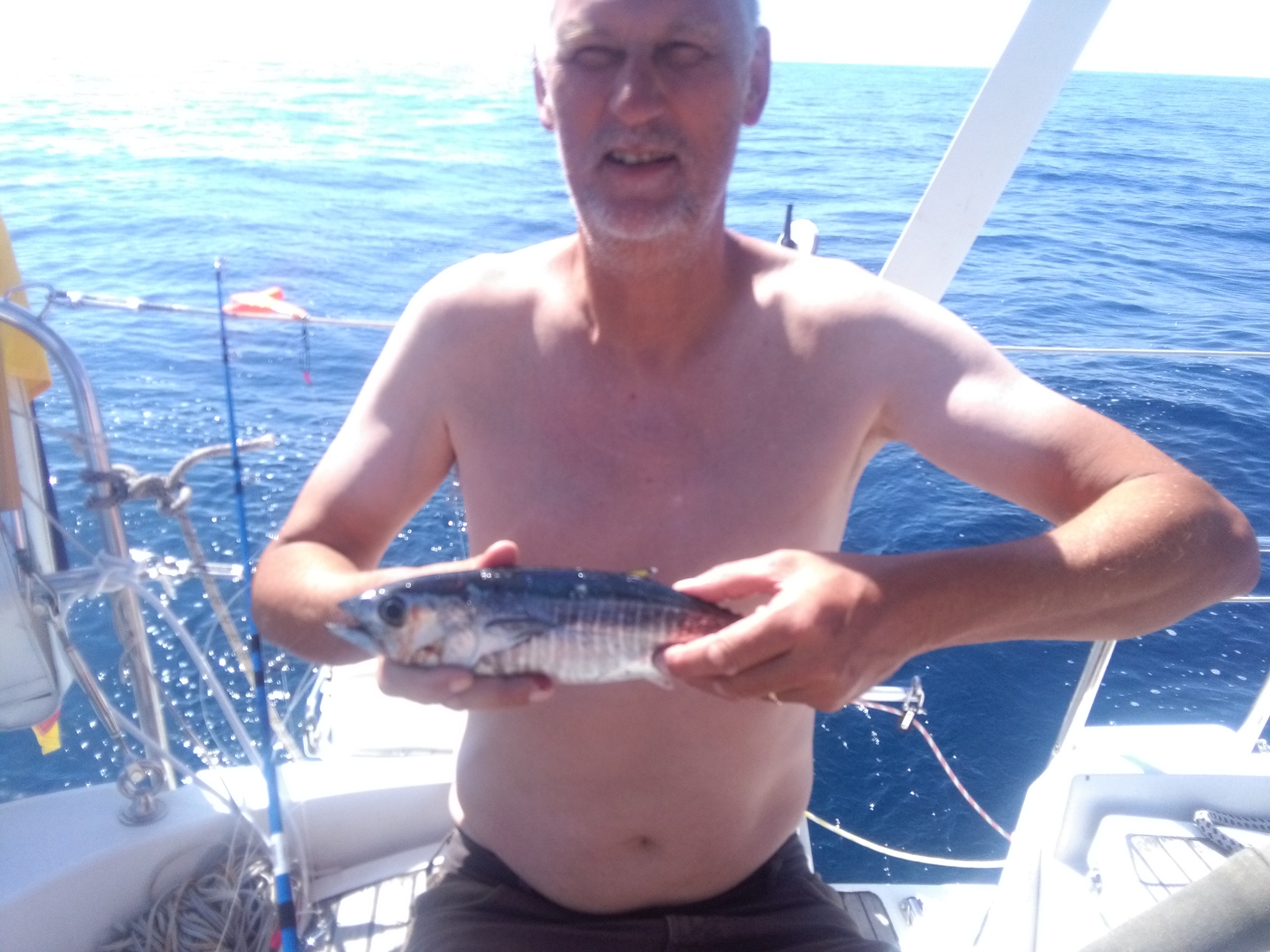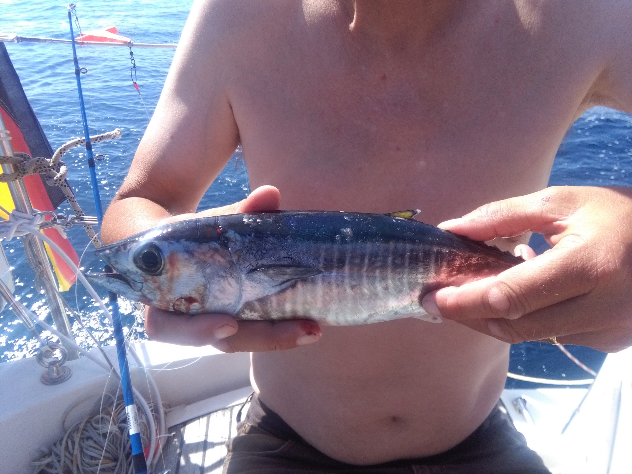 Die in Olhão neu erstandene Angel bewährt sich sofort. Wie vom Verkäufer versprochen lassen die Thunfische auf 50 m Wassertiefe nicht auf sich warten.