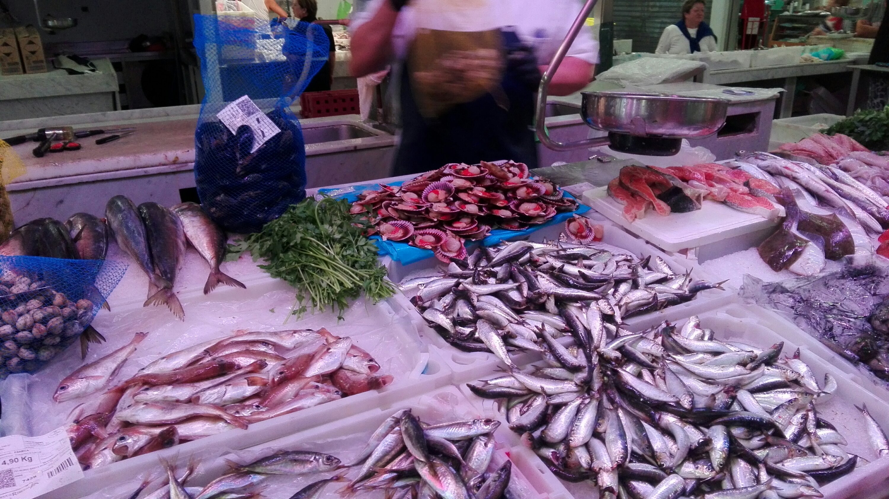 Der Hafenmeister nimmt uns freundlicherweise in seinem Bus mit nach Boiro. Da bestaunen wir das reichliche Angebot an Fischen, Meeresfrüchten, regionalem Gemüse, etc. Ein Genuss!