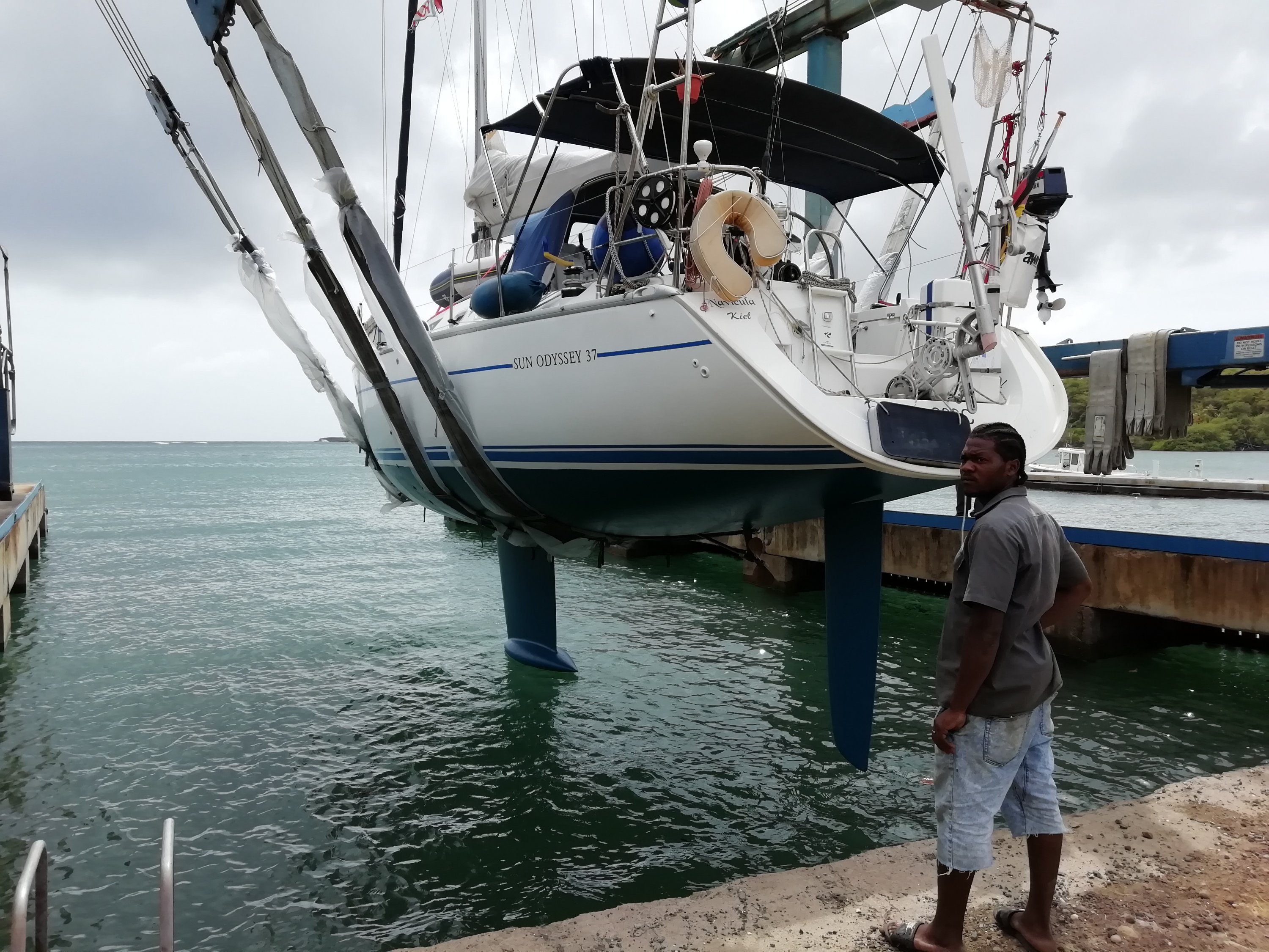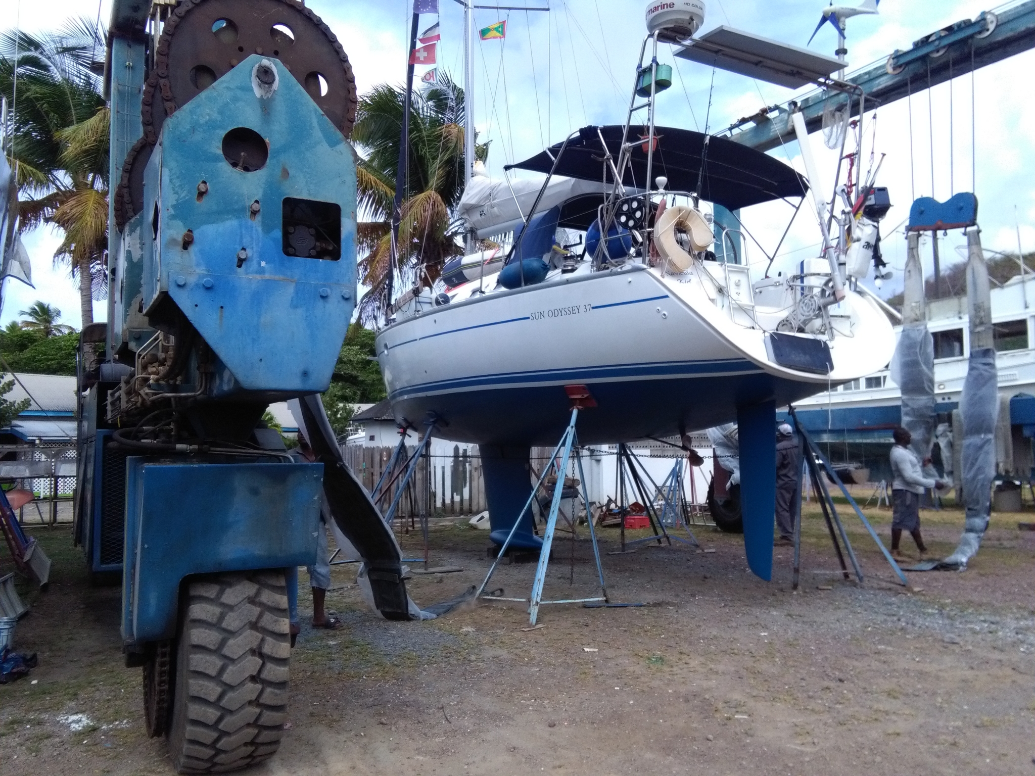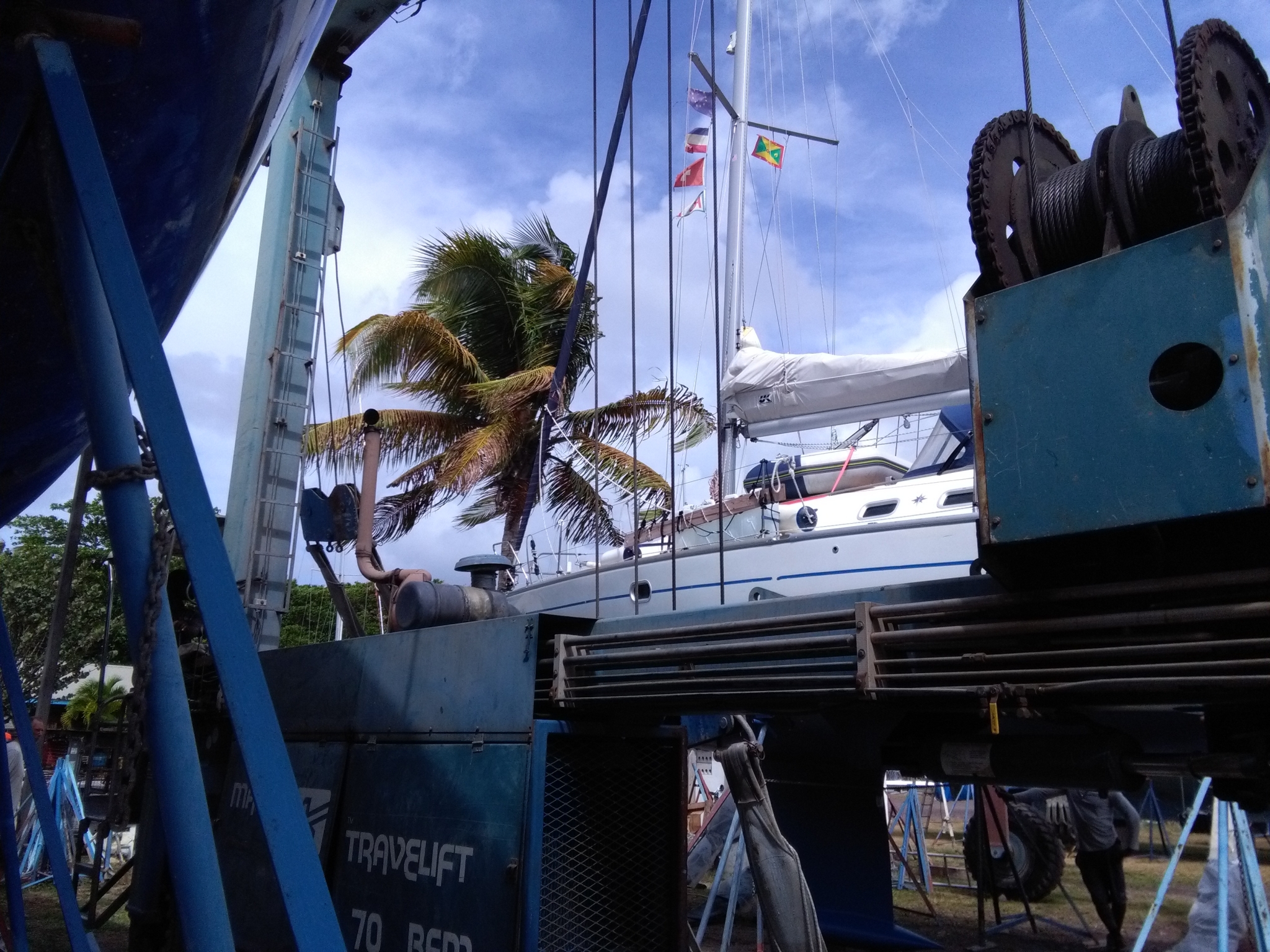 Just in dem Moment fährt der Mechaniker für unseren Motor vorbei und bemerkt, dass unsere Zinkanode schon sehr stark abgenutzt ist und dringend erneuert werden muss. So darf das Boot nicht ins Wasser. Da es leider hier keine passende Anode gibt, müssen wir nochmal nach St. George fahren und eine besorgen. Also wird die Kranarbeit unterbrochen, alle müssen warten. Nützt ja nichts!