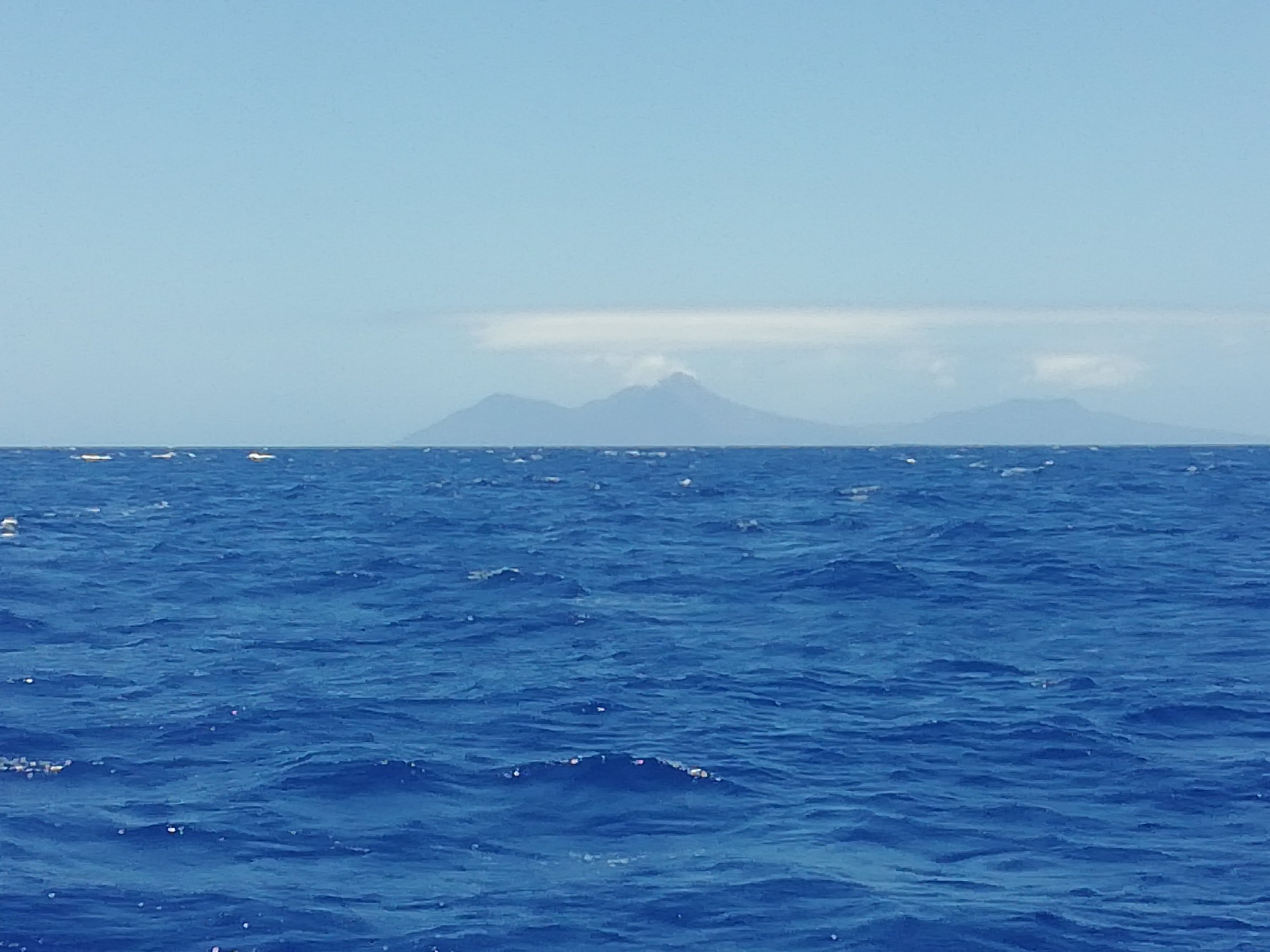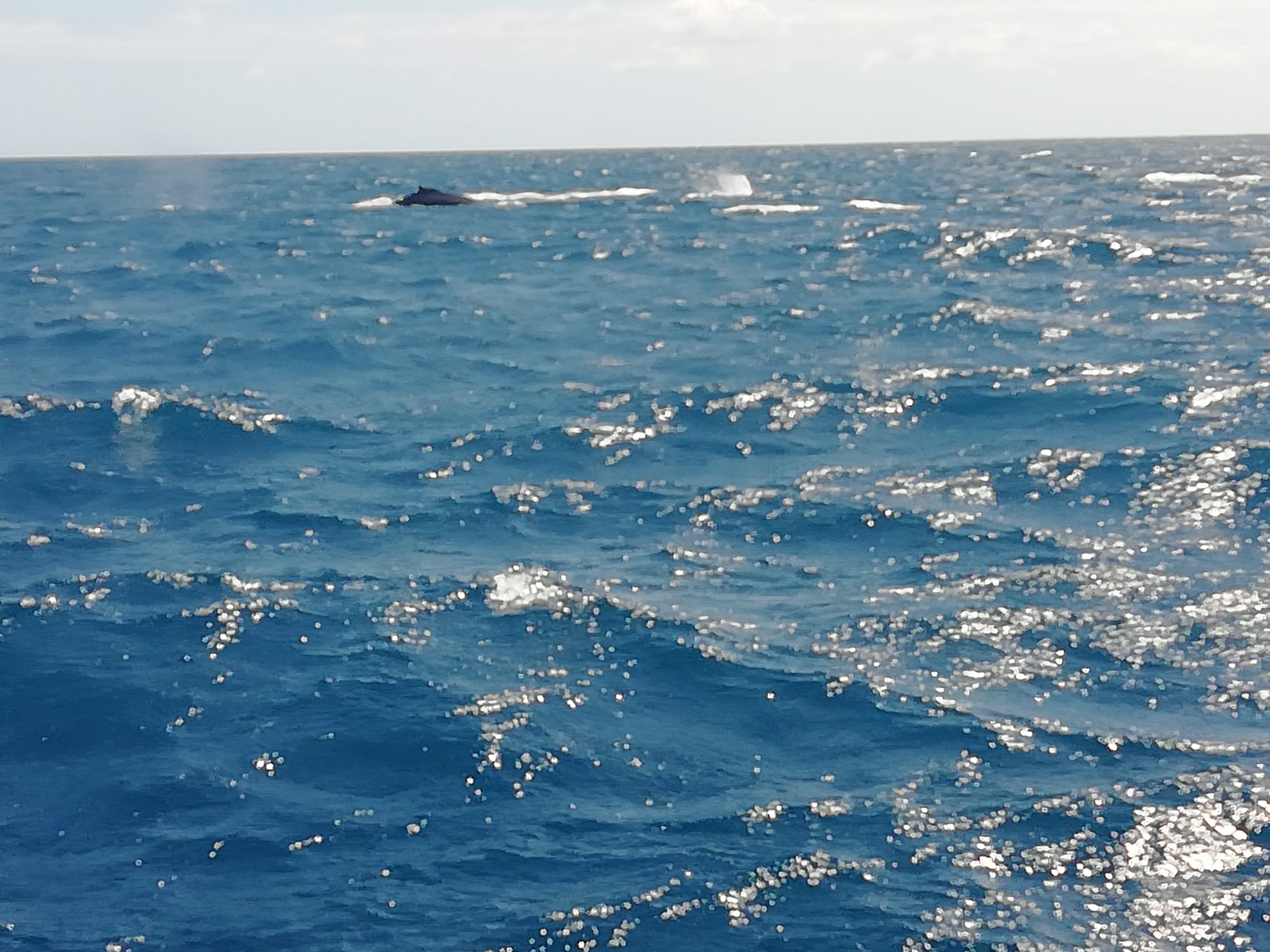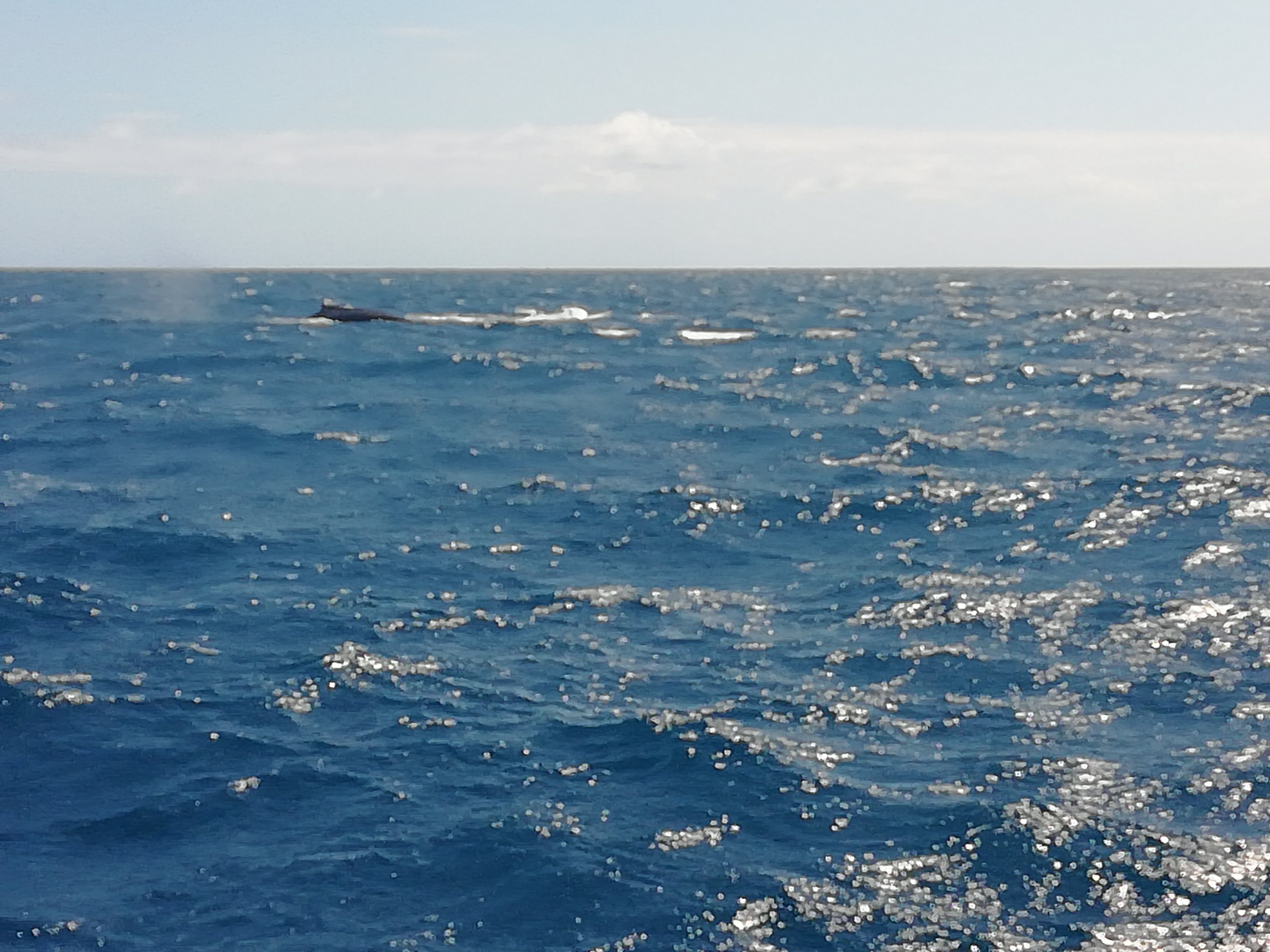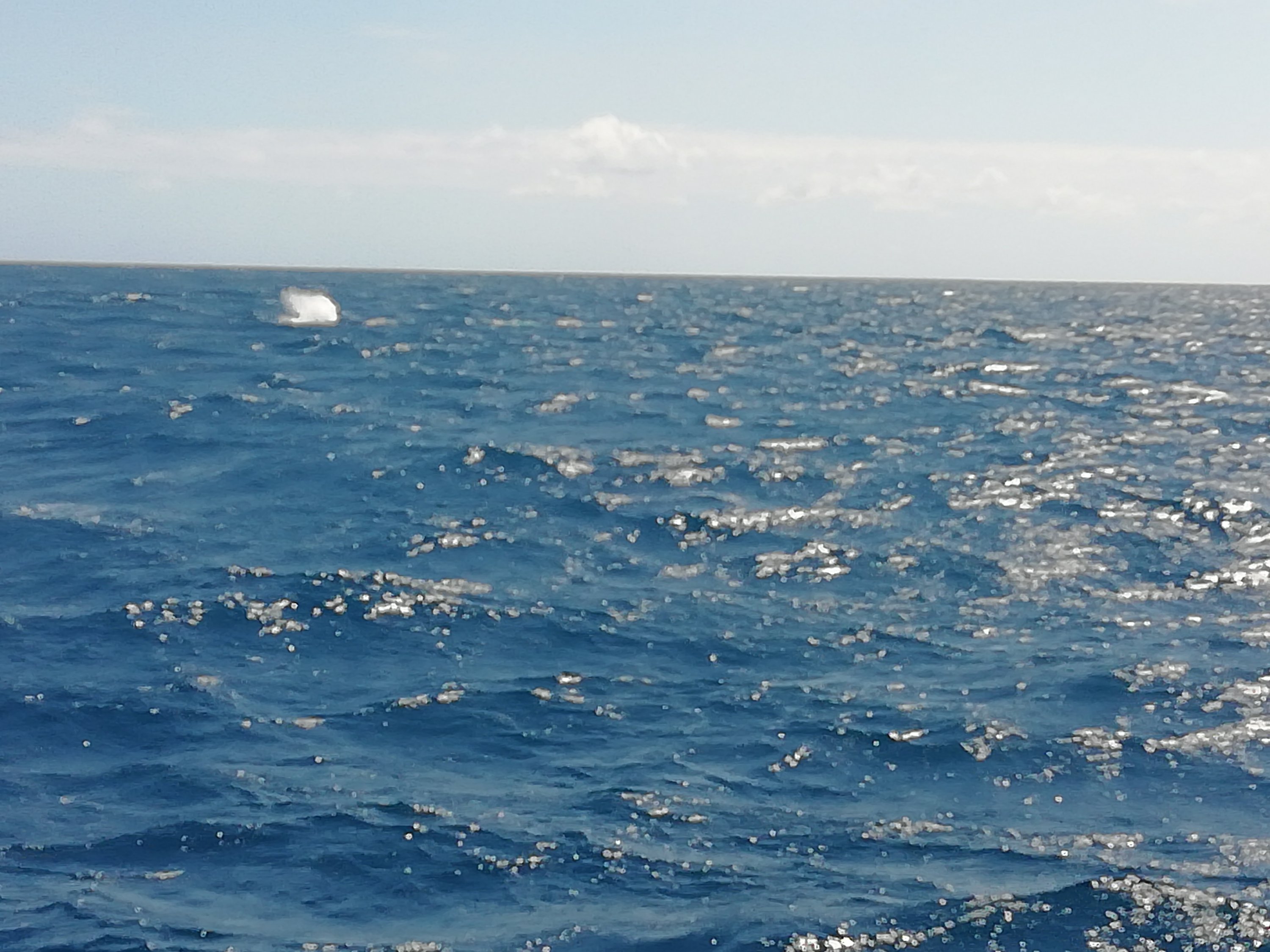 Knapp nordwestlich von Guadeloupe. Tatsächlich, ein Wal an Steuerbord, so lang wie unser Boot! Aber nicht in sicherer Entfernung – nein – vielleicht drei Schiffslängen voraus auf Kollisionskurs!!!!