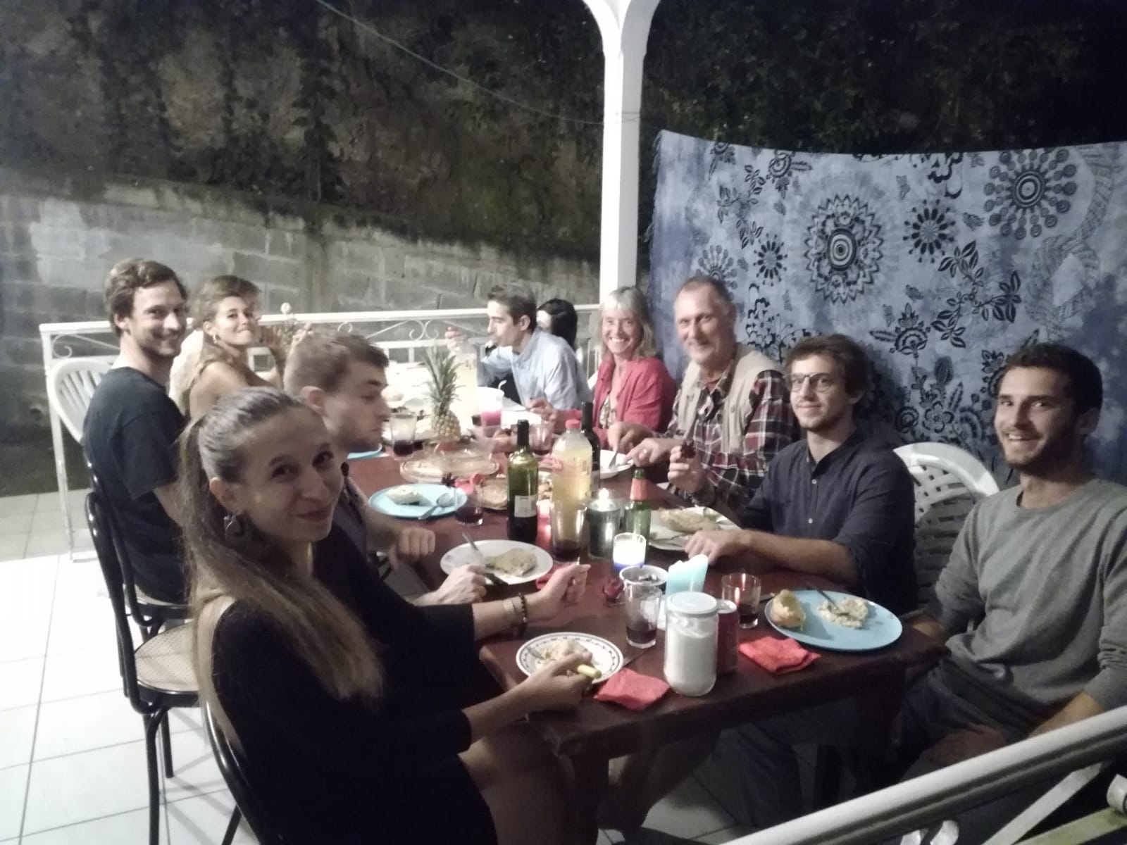 Weihnachtsfeier in Koljas WG. Die Erasmus-Studenten haben sich richtig ins Zeug gelegt und ein mehrgängiges Menu kreiert mit kreolischen und italienischen Rezepten. Acras de fruit à pain, Christophines en Gratin, Parmigiana, Kürbis Risotto, Bruschetta, Marlinspieße, gefüllte Champignons, diverse Kuchen…….