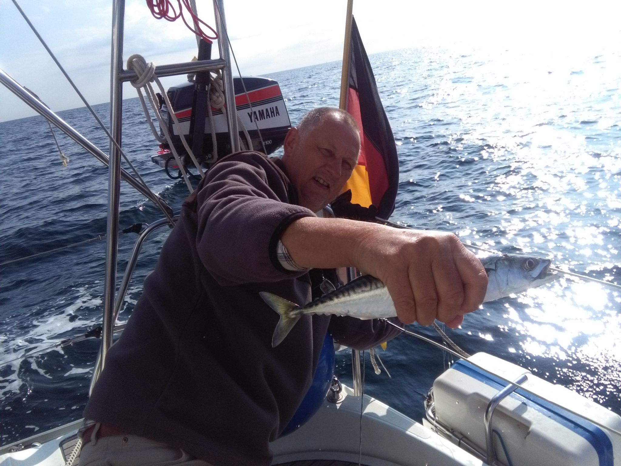 Der Fischfänger hängt im Wasser und um 9 Uhr 10 zappelt die erste Makrele am Haken.