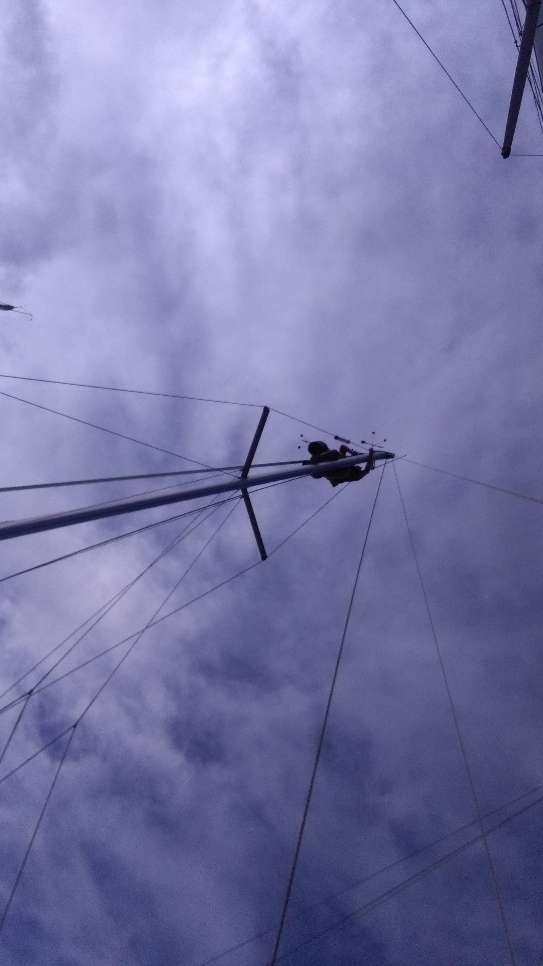 Jetzt wird es ernst. Die Genua muss wieder am Vorstag angeschlagen werden. Dazu muss der Kopf der Rollreff-Anlage heruntergeholt werden. Der neue Windex-Windanzeiger muss ebenfalls montiert werden. Dazu muss “Jemand“ in den Mast hoch. DIE Gelegenheit den Topclimber auszuprobieren. Das ist ein Bootsmannstuhl, mit dem man sich quasi selbst in den Mast hochziehen kann. Das System arbeitet mit Seilklemmen die dem Bergsteiger-Equipement entlehnt wurden.