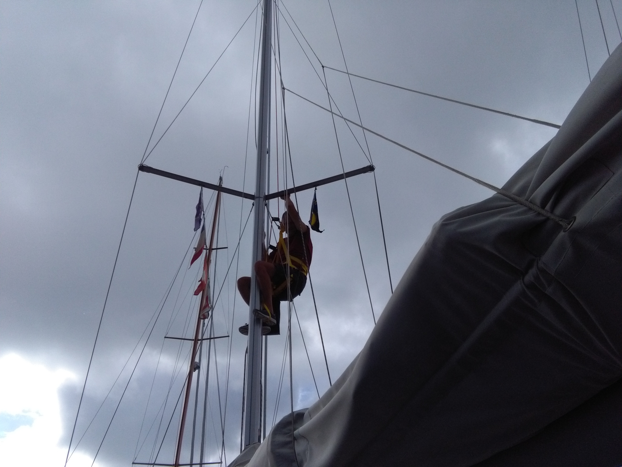 Nach anfänglichem Fremdeln geht es aber erstaunlich gut und “Jemand“ kommt gut oben an. 30 Minuten später ist alles repariert. Das Boot ist wieder seeklar!