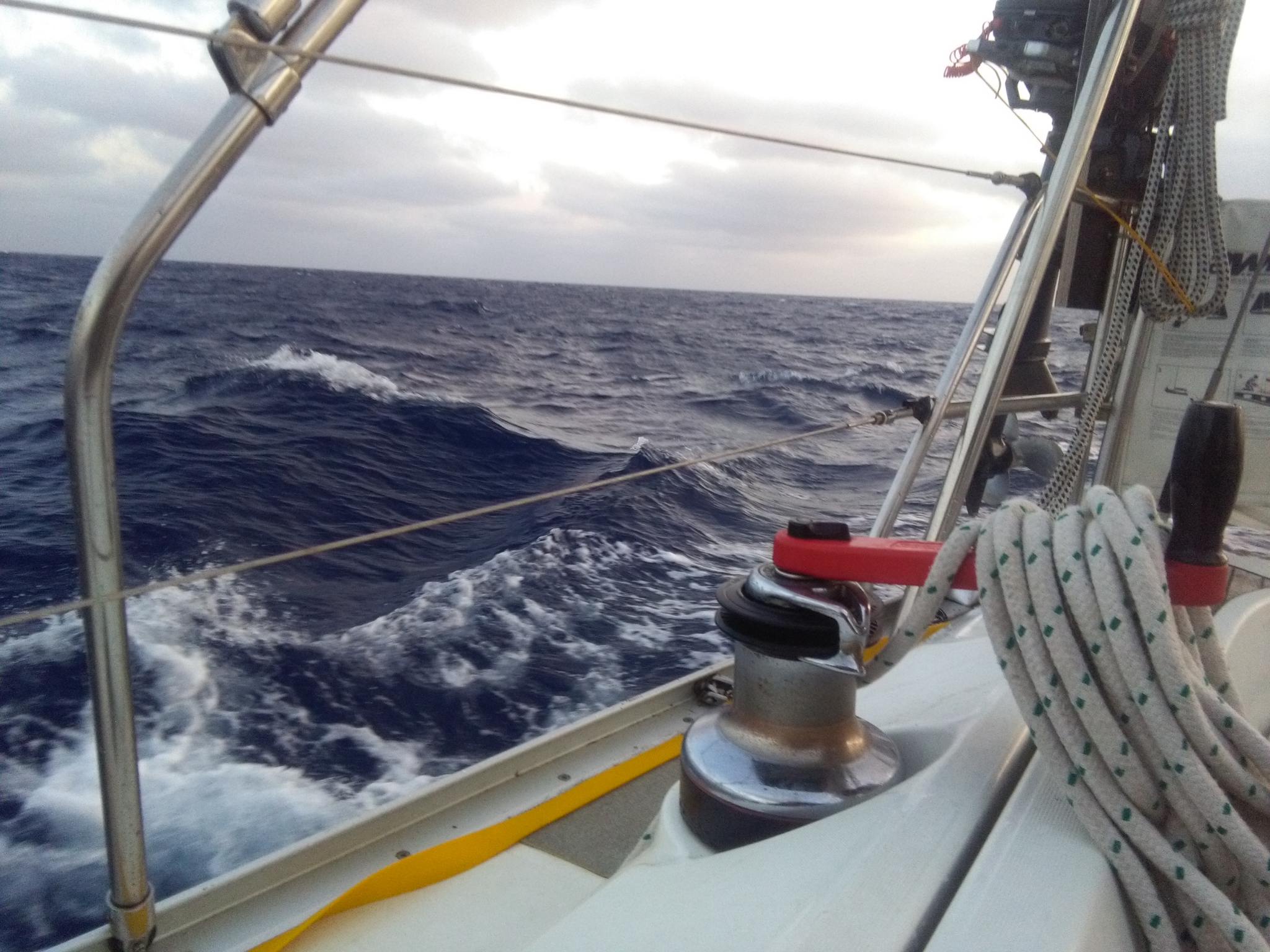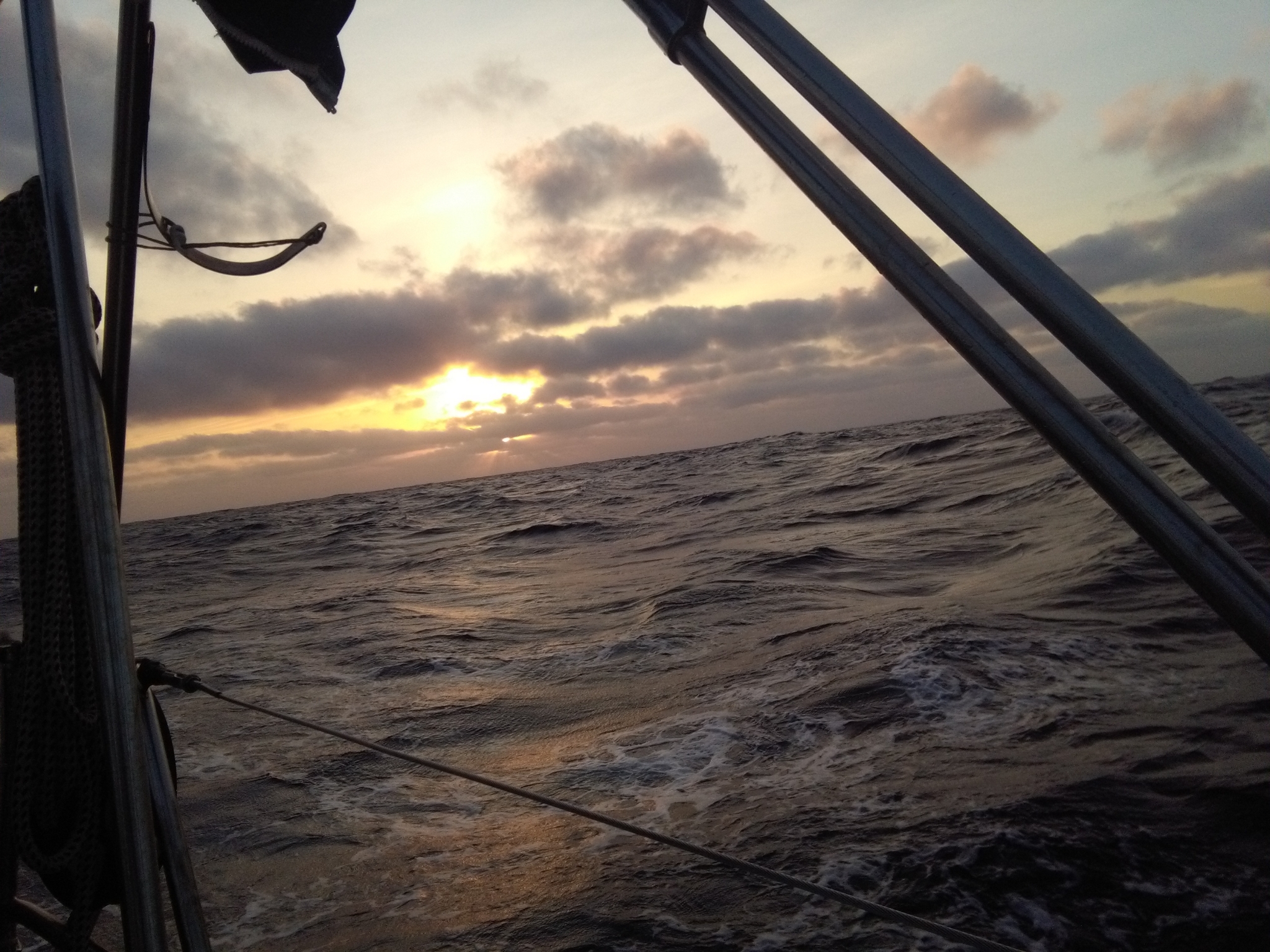 Zum Glück haben wir den Parasailor vor dem Dunkelwerden reingeholt. Es brist ziemlich stark auf, das wäre kein Vergnügen geworden. Die Wellen sind ruppig und unangenehm, was ein Schlafmangel zur Folge hat. Und die Nacht richtig schwarz.