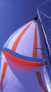 Heute ist ideales Wetter, unseren Parasailor nochmal zu testen. Sonne und Windstärke 3 aus Ost, als wir Fehmarn verlassen. Genug Zeit, alles in Ruhe auszuprobieren. Kein Stress wegen starkem Wind die Leinen zu vertüdeln etc.pp. Alles klappt prima, bis der Wind einschläft und unser kostbares Stück im Wasser landet. Wir packen den ganzen Krempel kurz entschlossen erstmal weg und warten auf besseren Wind. Am späten Nachmittag erfolgt ein weiterer Versuch. Diesmal mit Erfolg. Hier der Beweis:
